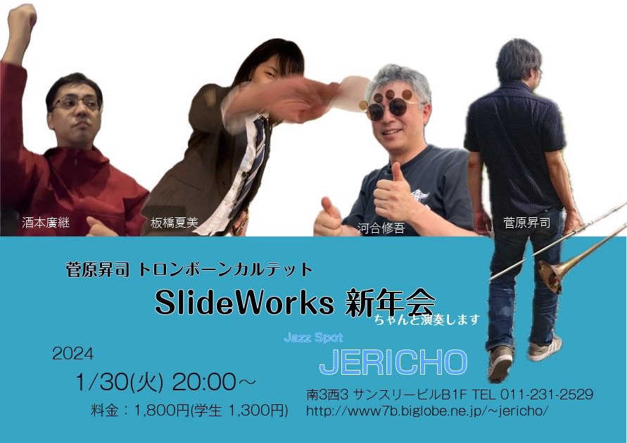 火曜日、1/30は菅原昇司ジャズトロンボーンカルテットによるSlide Works新年会!Sliding out参加トロンボーン奏者が一堂に会してトロンボーンのみのジャズカルテットを披露します。(普通にライブします)