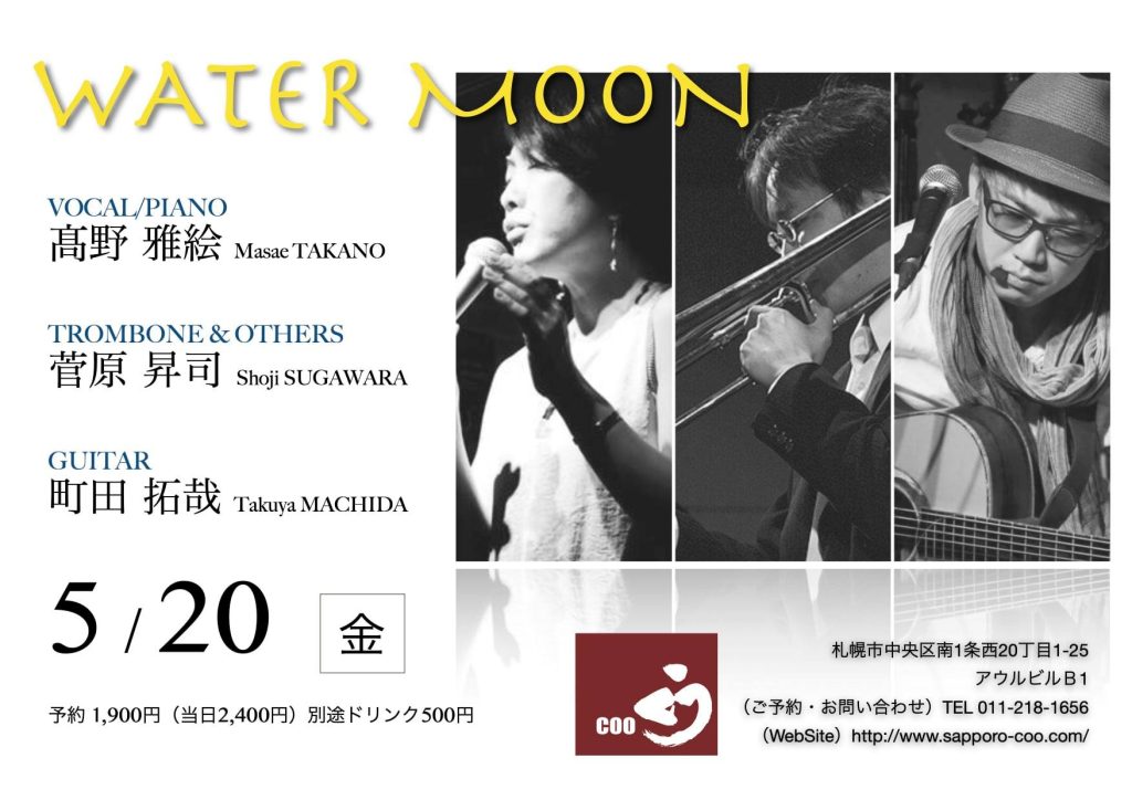 本日のライブは「Water Moon」 音楽 2022.05.20 くうで19時30分から 普段は歌のみの髙野雅絵さん、今日はピアノも演奏するようです。 私もなにかトロンボーン以外を演奏するようです。 よろしくお願いいたします。