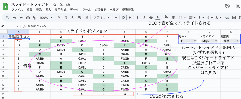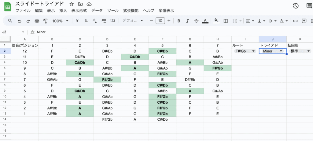 - ルート音やトライアドをプルダウンで選ぶと、スプレッドシート上の音名や色が変化。