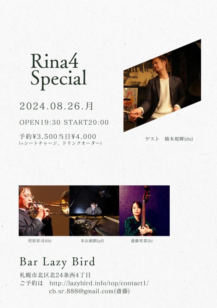 今日の里菜4special+1 音楽 2024.08.26 鈴木央紹さんが出演できなくなりました。 斎藤里菜(b)菅原昇司(tb)本山禎朗(p)橋本現輝(ds) このメンバーでのカルテットとなります。 予約¥3500当日¥4000
